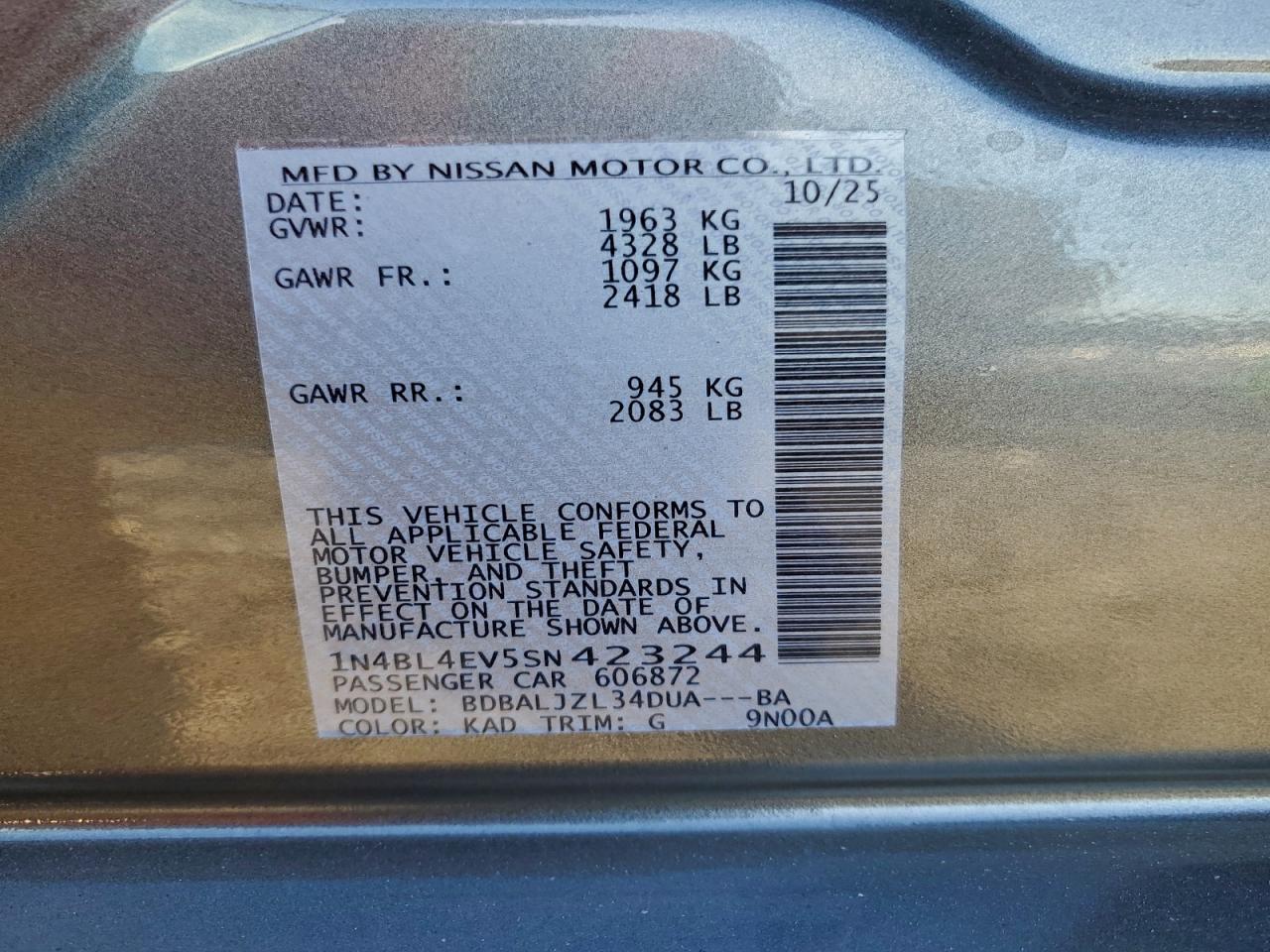 - ВИН: 1N4BL4EV5SN******