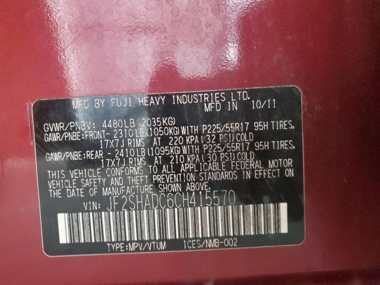 - ВИН: JF2SHADC6CH******