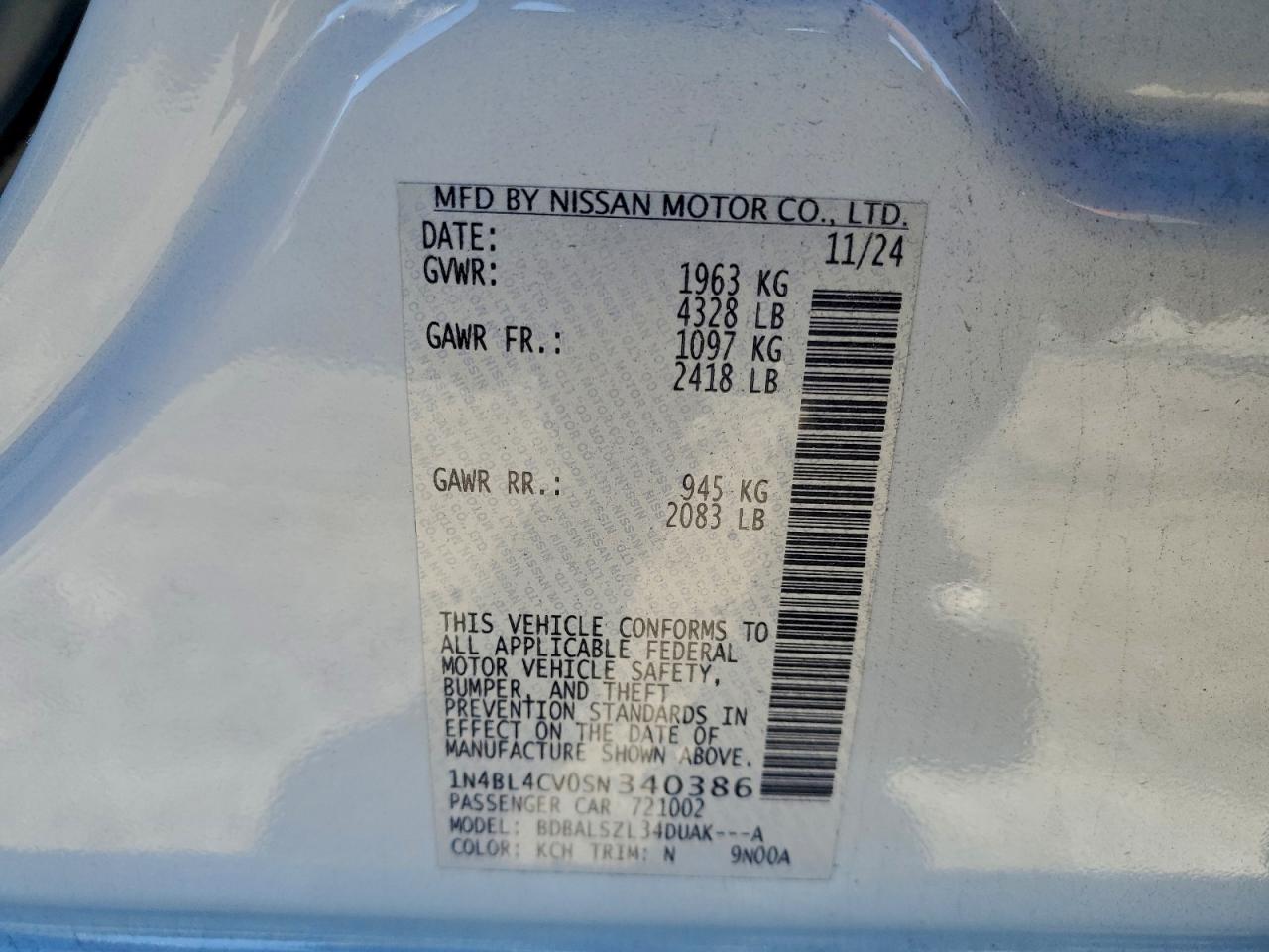 - ВИН: 1N4BL4CV0SN******