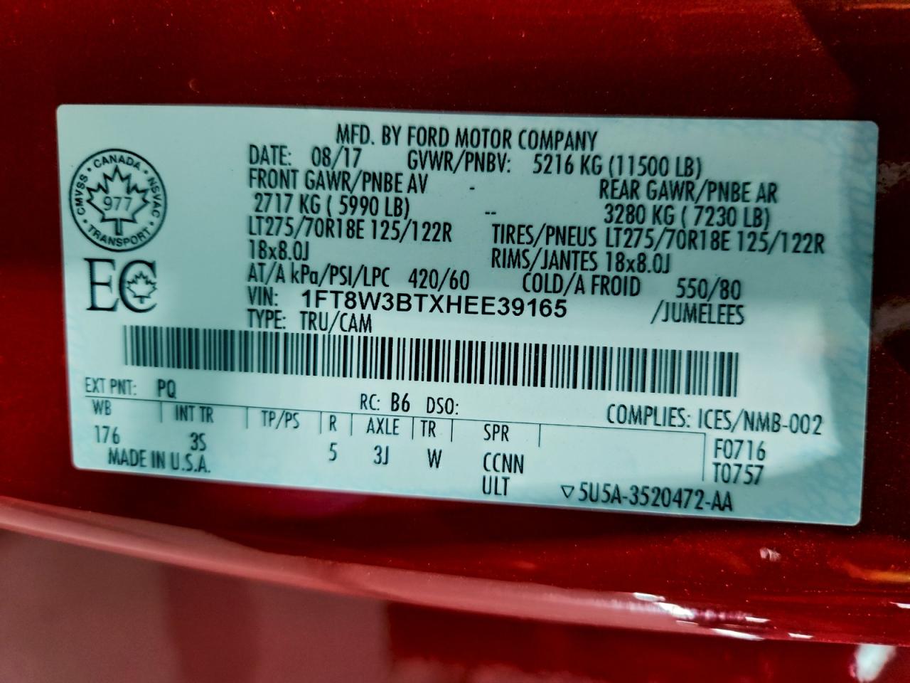 - ВИН: 1FT8W3BTXHE******
