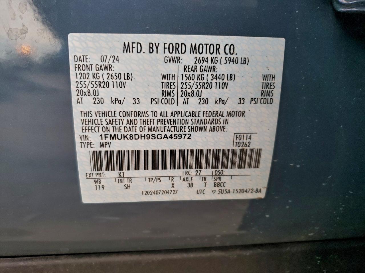 - ВИН: 1FMUK8DH9SG******
