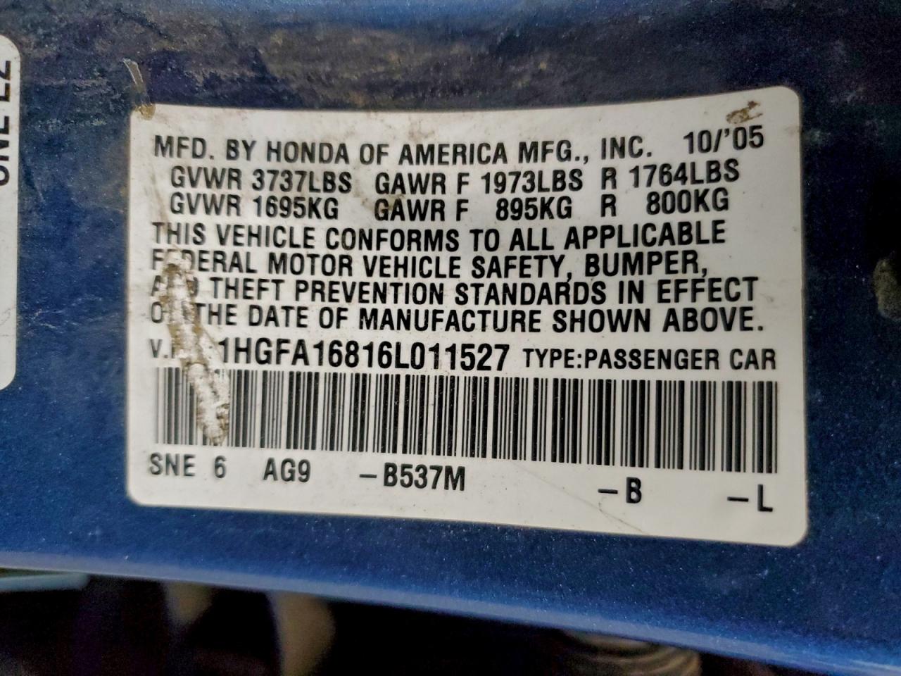 - ВИН: 1HGFA16816L******