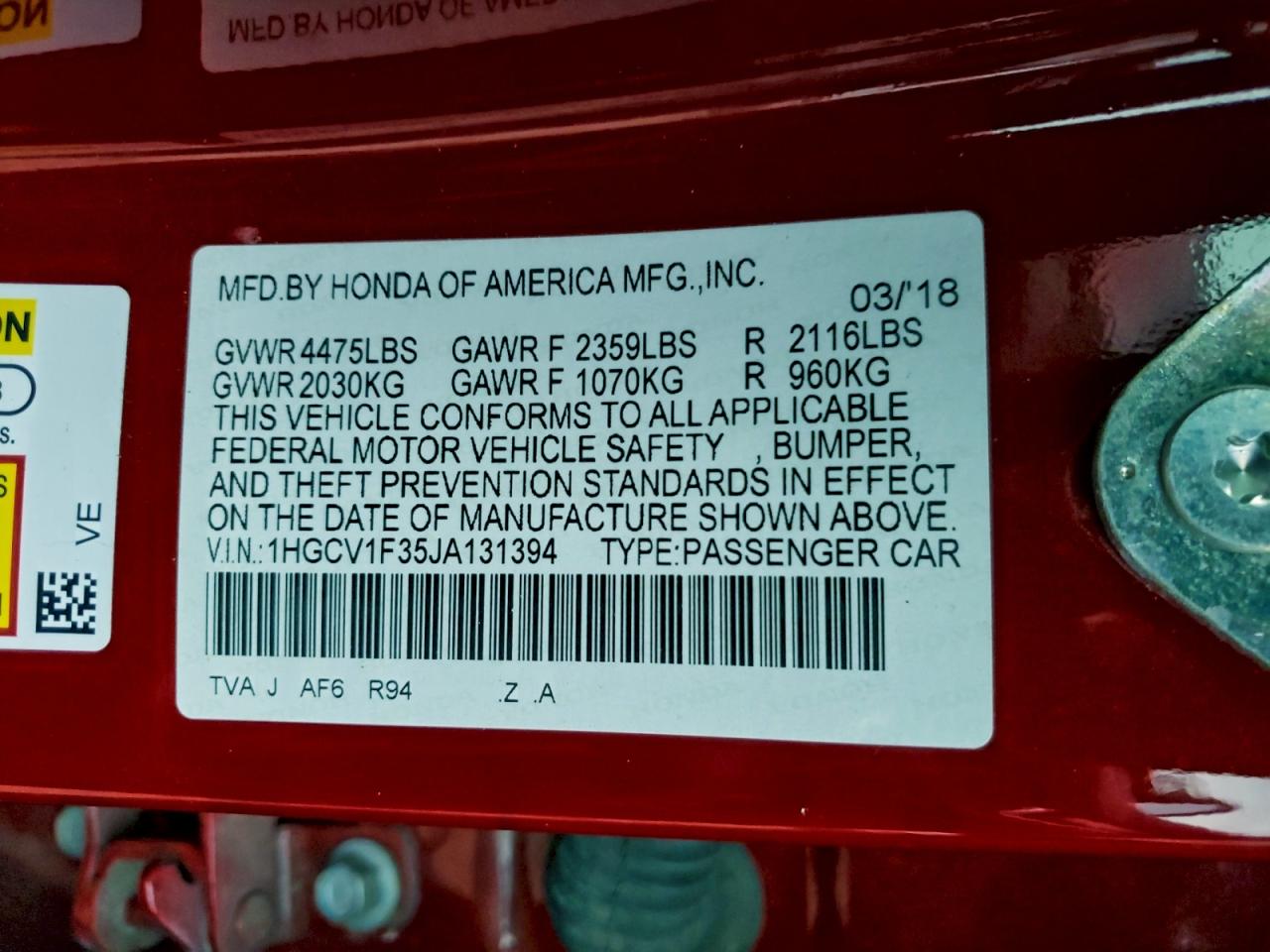 - ВИН: 1HGCV1F35JA******