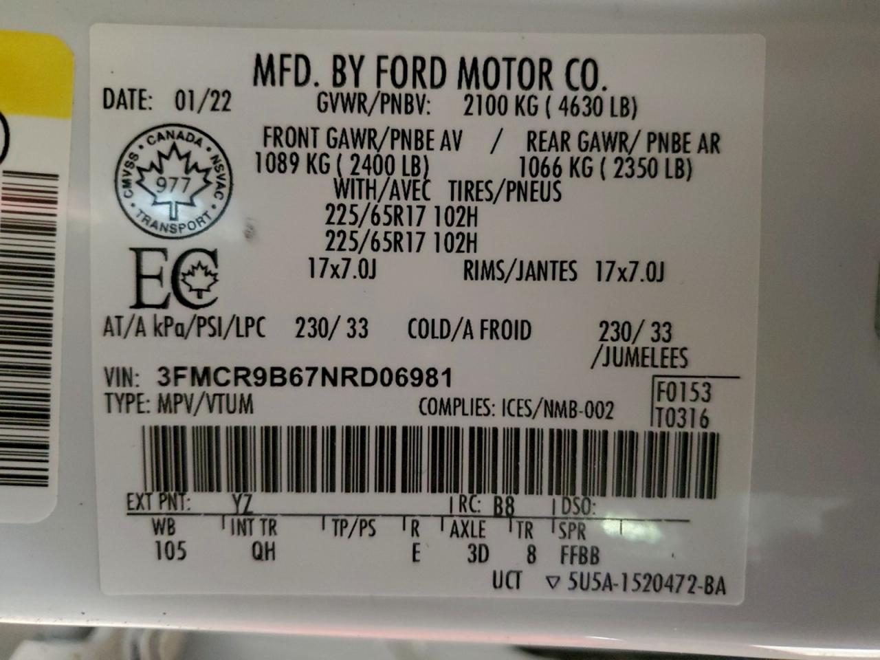 - ВИН: 3FMCR9B67NR******