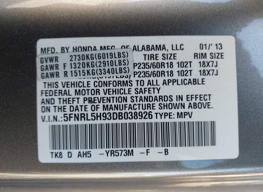 - VIN: 5FNRL5H93DB038926