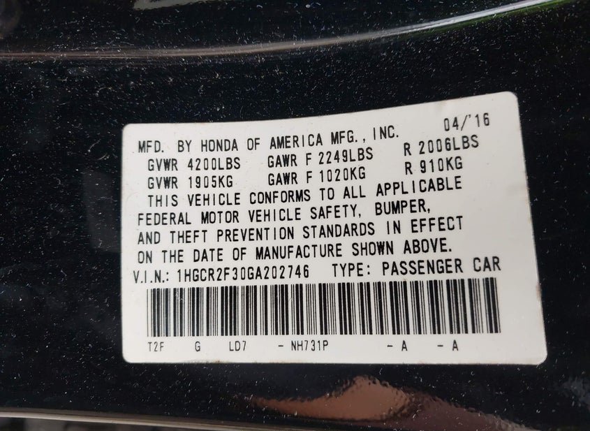 - VIN: 1HGCR2F30GA202746