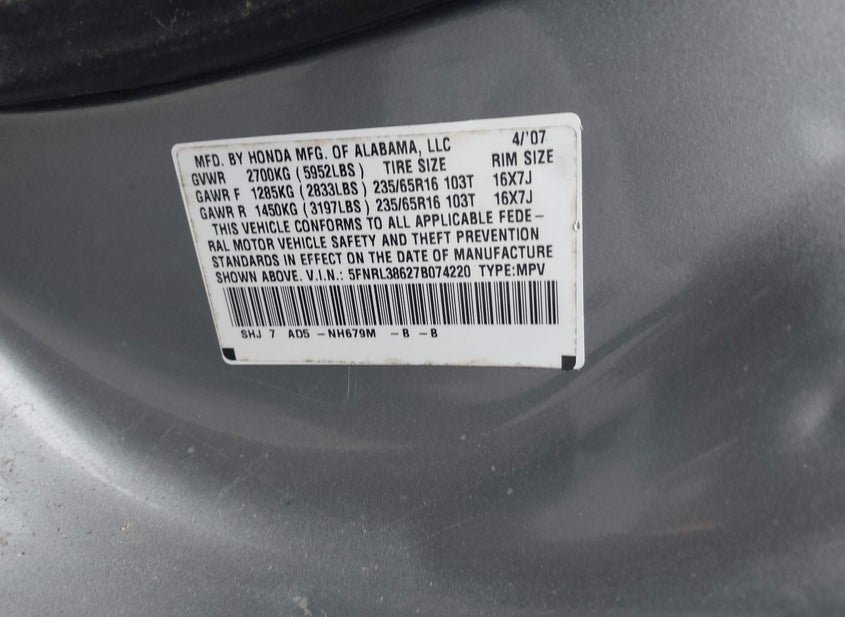 - VIN: 5FNRL38627B074220
