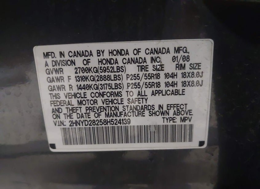 - VIN: 2HNYD28258H524139