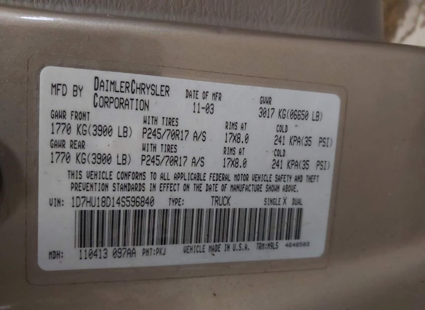- Название лота: 2004 DODGE RAM 1500 SLT/LARAMIE