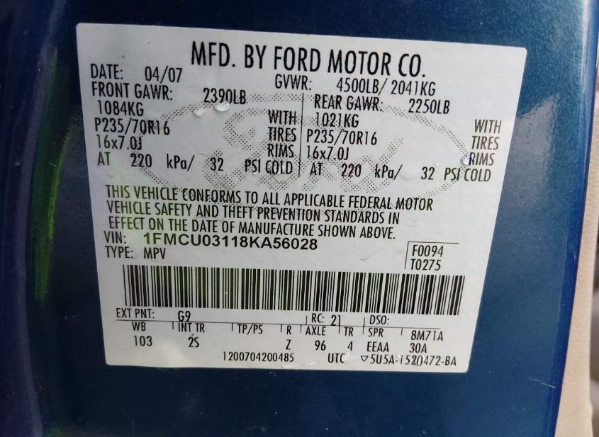 - VIN: 1FMCU03118KA56028