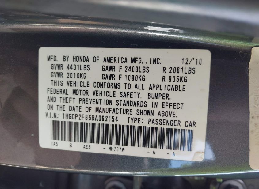 - VIN: 1HGCP2F85BA062154