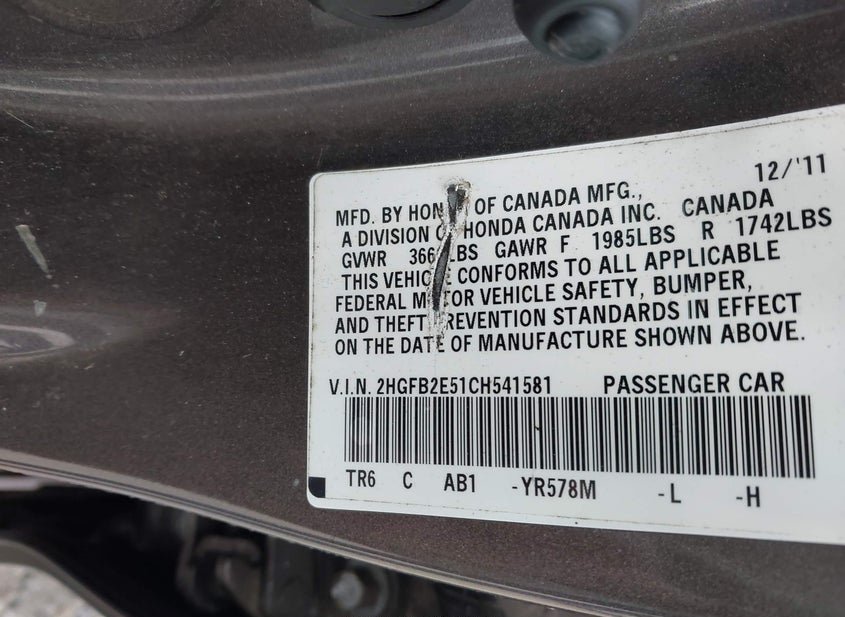 - VIN: 2HGFB2E51CH541581
