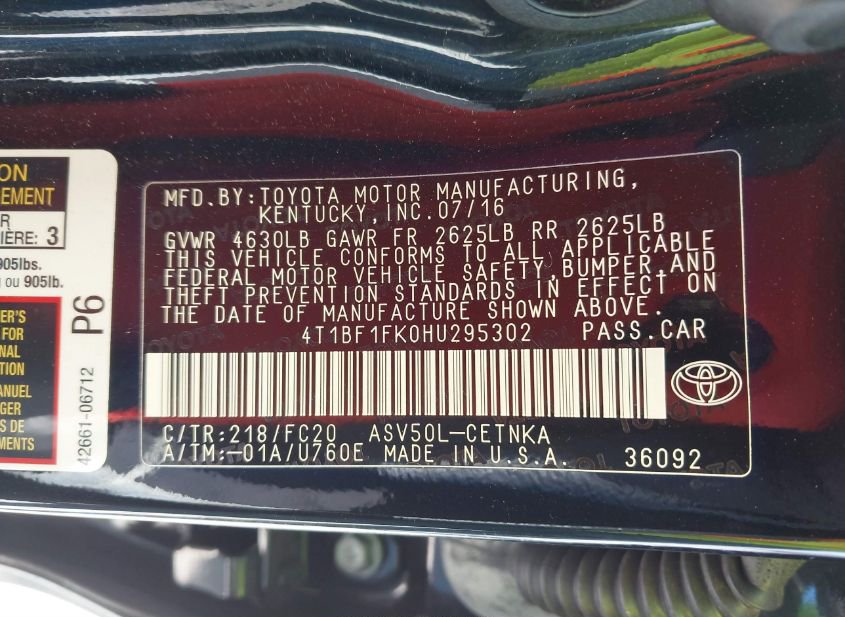 - VIN: 4T1BF1FK0HU295302