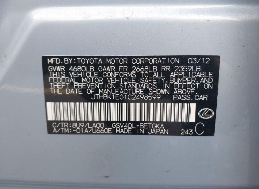 - Название лота: 2012 LEXUS ES 350