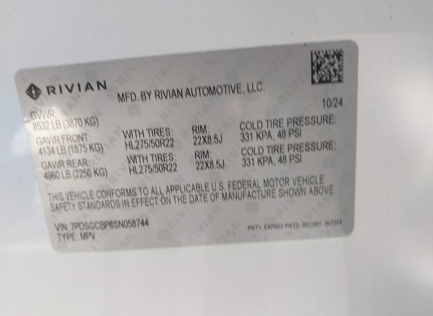 - Название лота: 2025 RIVIAN R1S ASCEND TRI MOTOR MAX PACK/PREMIUM TRI MOTOR MAX PACK