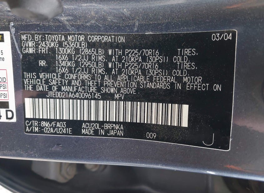 - VIN: JTEDD21A640096145