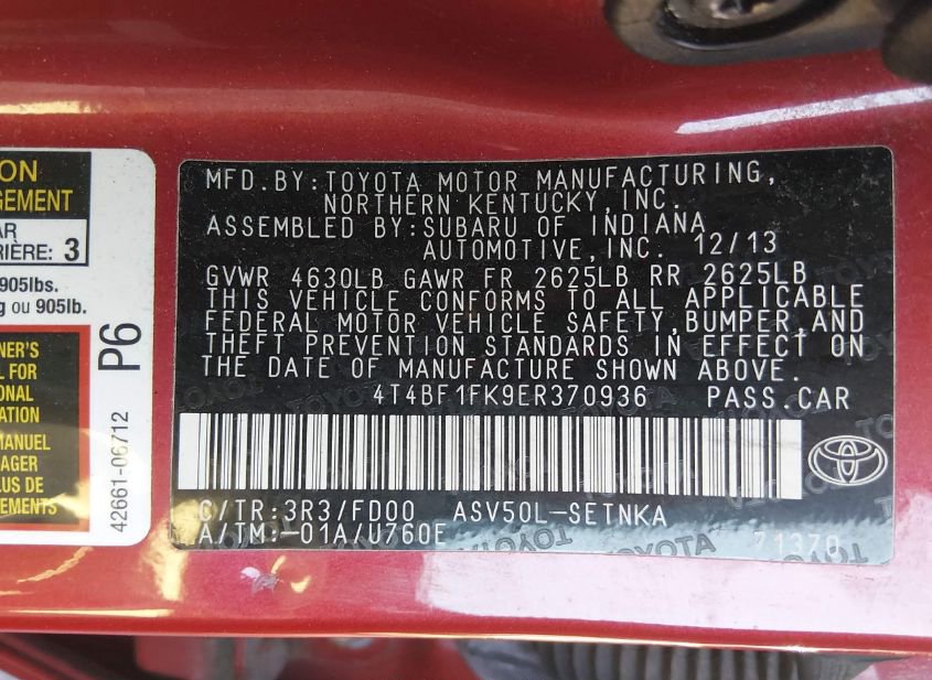 - VIN: 4T4BF1FK9ER370936