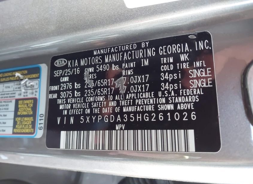- VIN: 5XYPGDA35HG261026