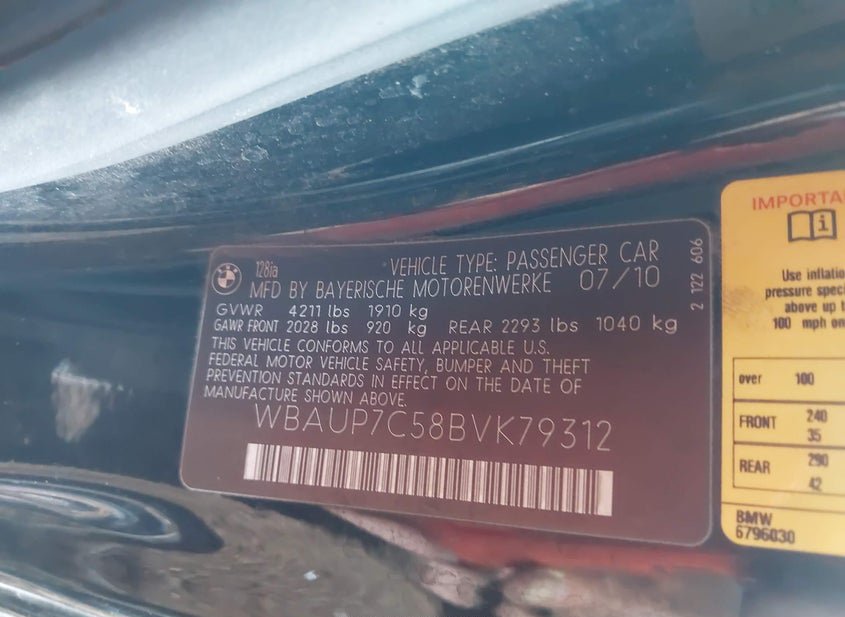 - VIN: WBAUP7C58BVK79312