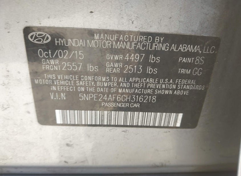 - VIN: 5NPE24AF6GH316218