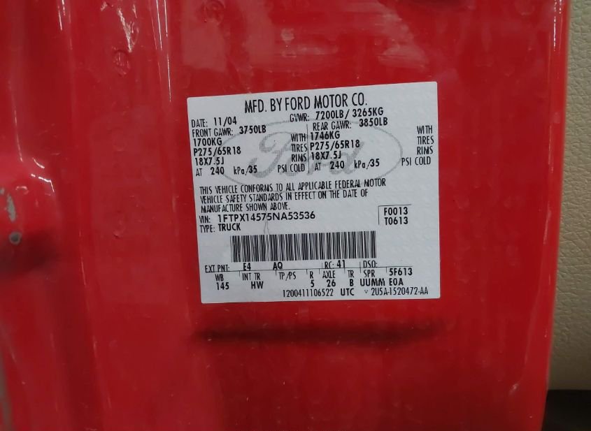 - Название лота: 2005 FORD F-150 FX4/LARIAT/XL/XLT