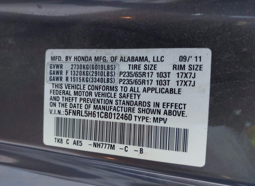 - VIN: 5FNRL5H61CB012460
