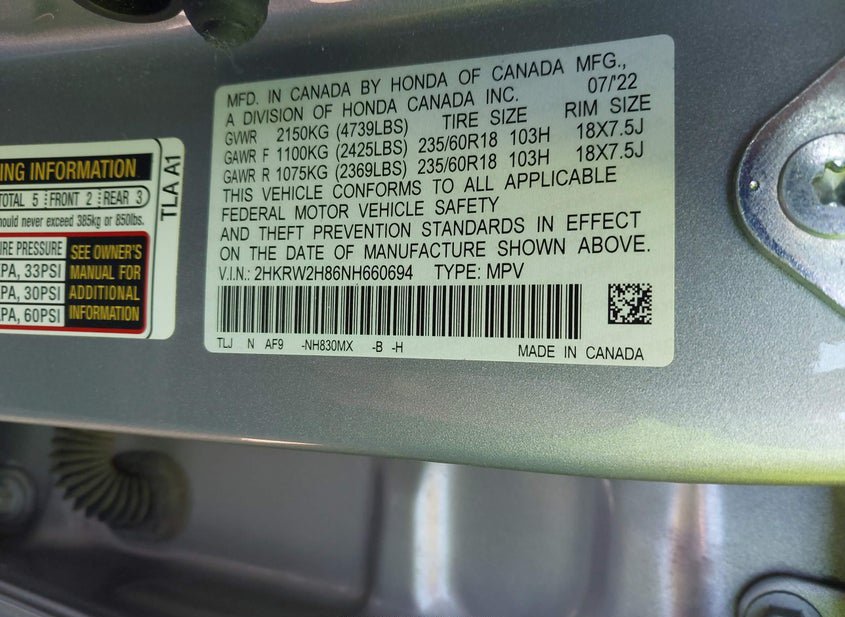 - VIN: 2HKRW2H86NH660694