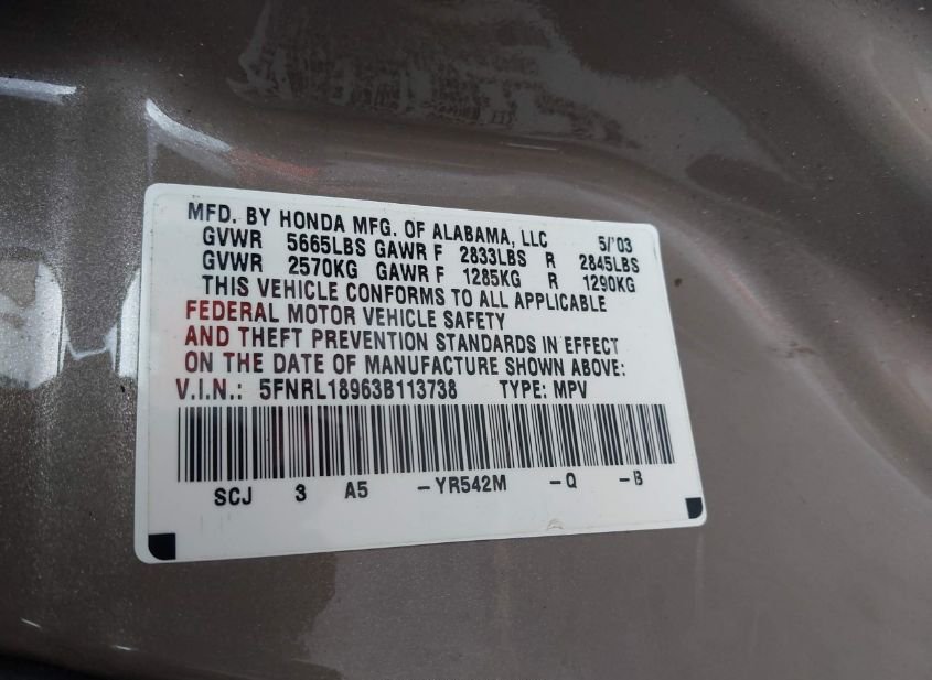 - VIN: 5FNRL18963B113738