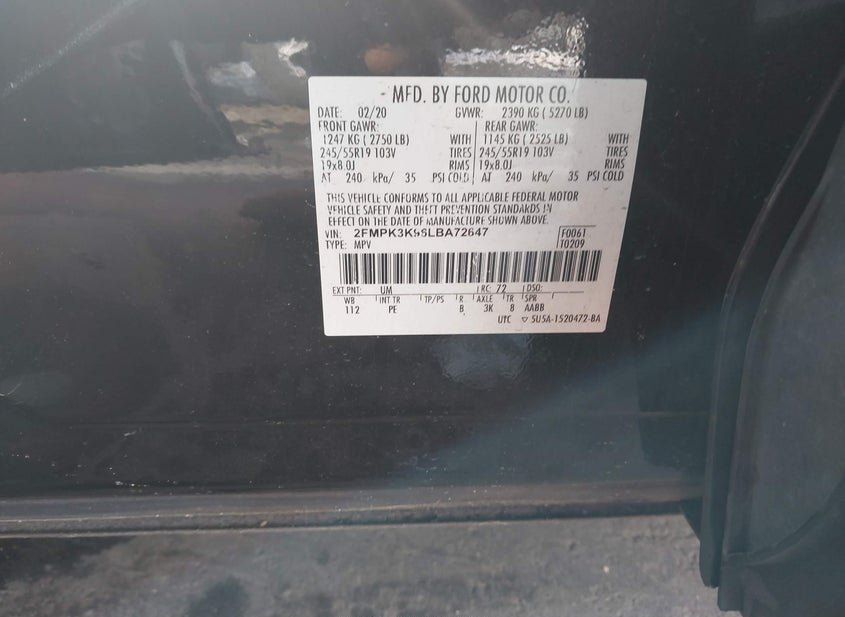 - VIN: 2FMPK3K96LBA72647