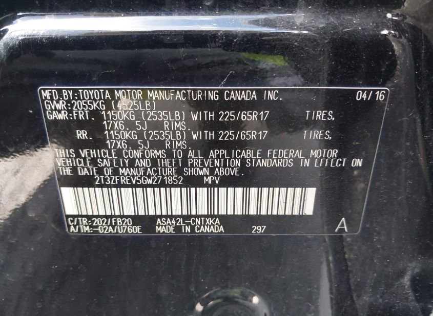 - VIN: 2T3ZFREV5GW271852