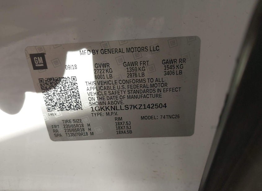 - VIN: 1GKKNLLS7KZ142504