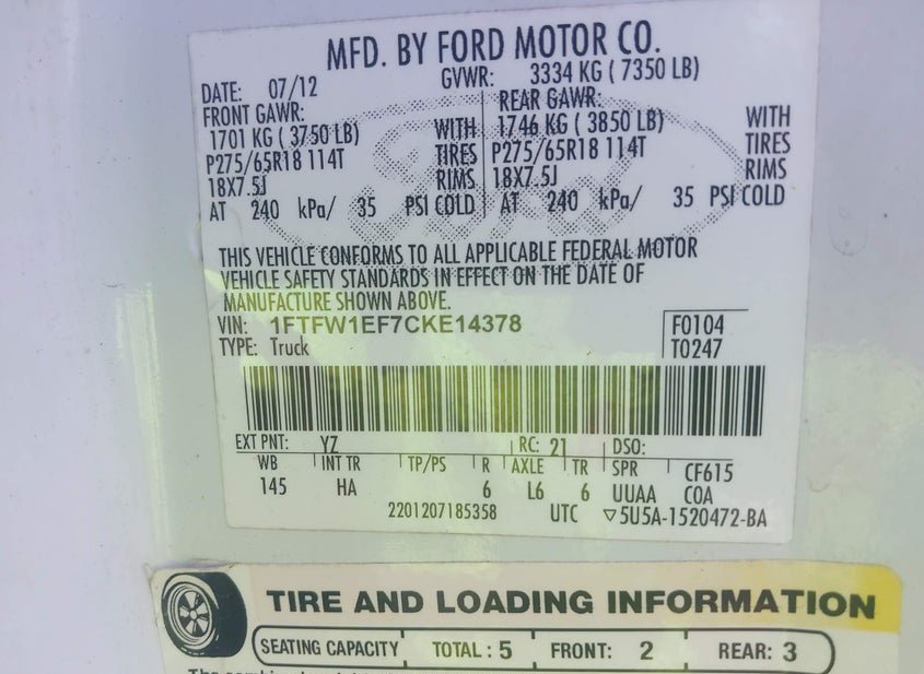 - VIN: 1FTFW1EF7CKE14378