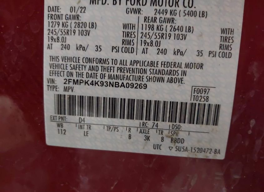 - VIN: 2FMPK4K93NBA09269
