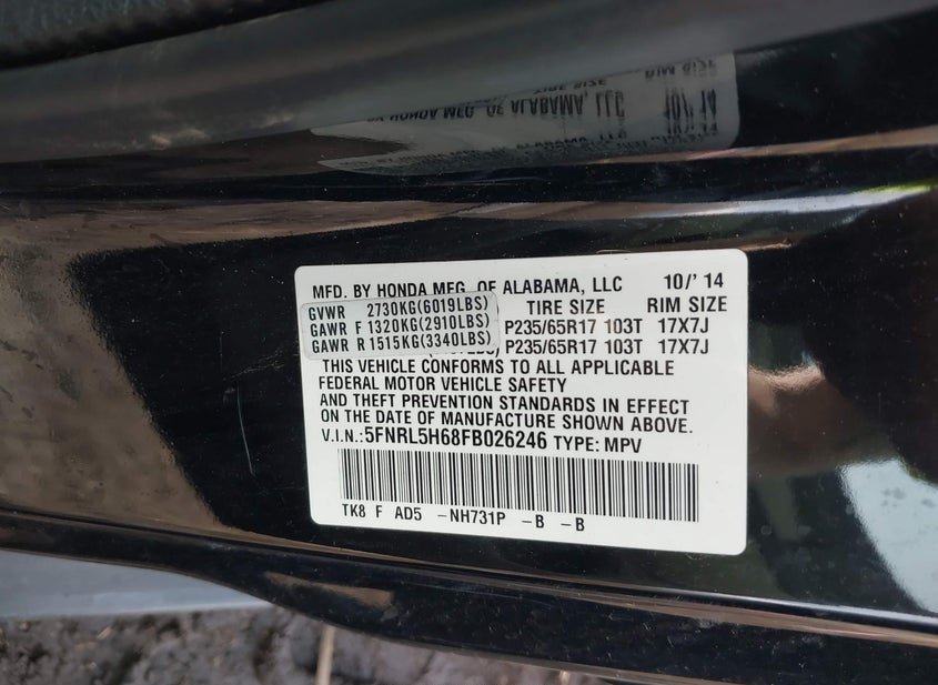 - VIN: 5FNRL5H68FB026246