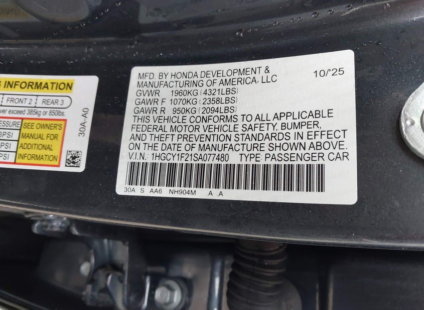 - VIN: 1HGCY1F21SA077480