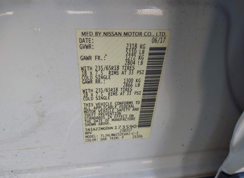 - VIN: 5N1AZ2MG0HN173590