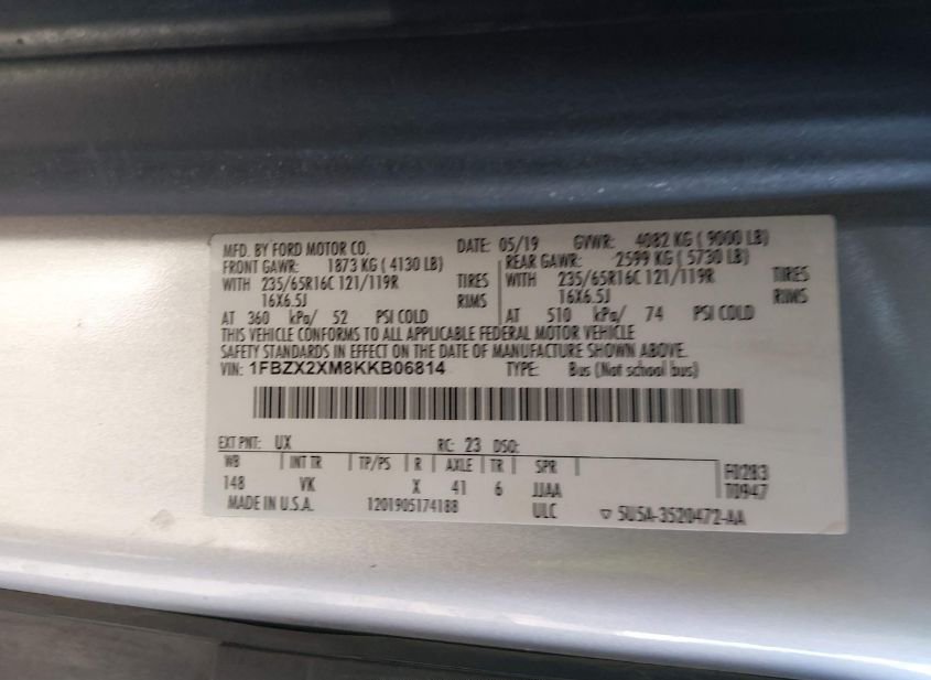 - VIN: 1FBZX2XM8KKB06814