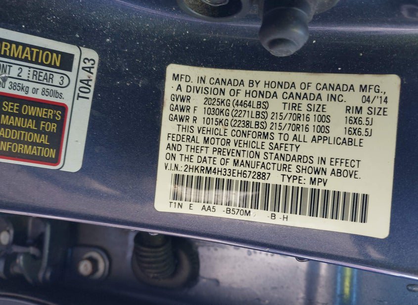 - VIN: 2HKRM4H33EH672887