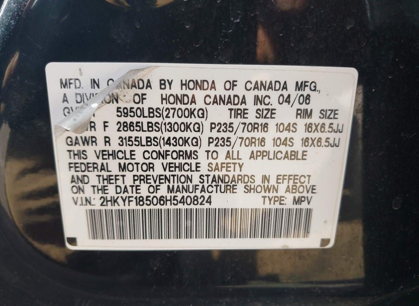 - VIN: 2HKYF18506H540824