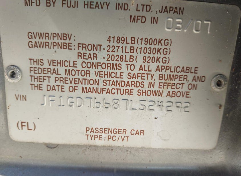 - VIN: JF1GD76687L524292