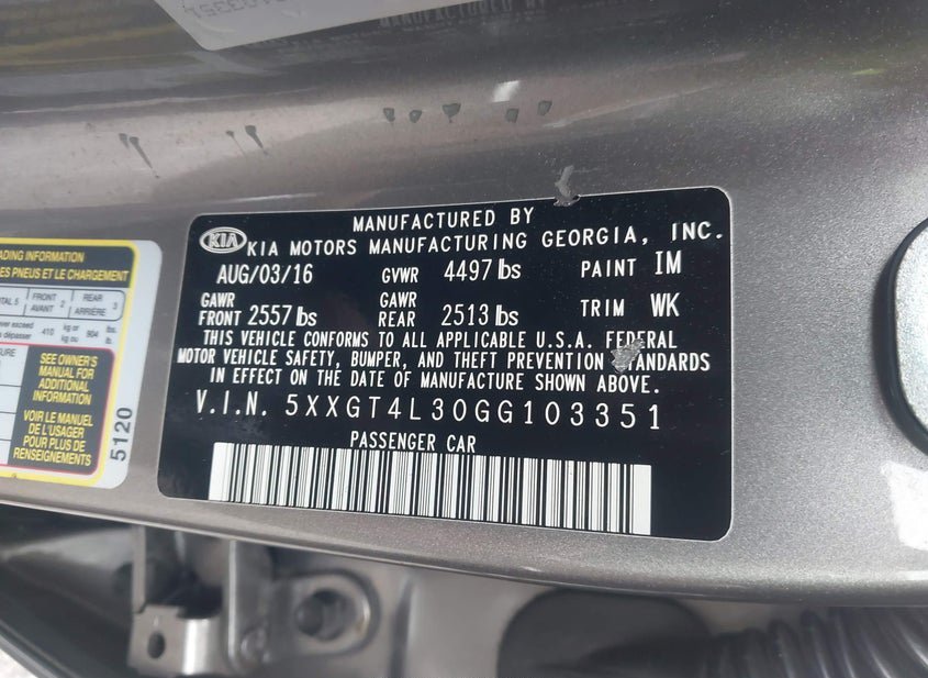 - VIN: 5XXGT4L30GG103351