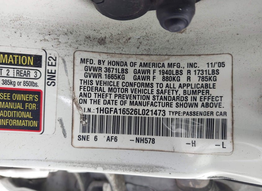 - VIN: 1HGFA16526L021473
