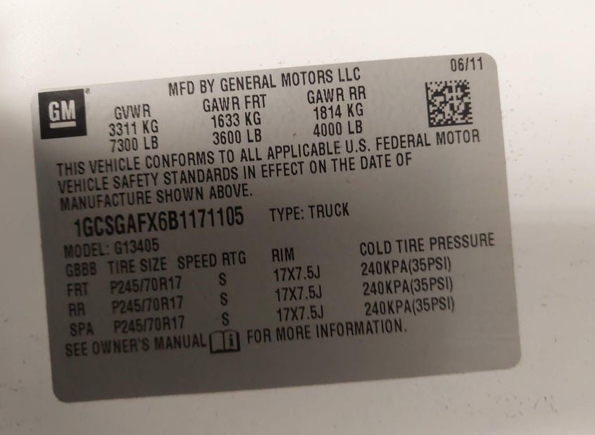 - VIN: 1GCSGAFX6B1171105