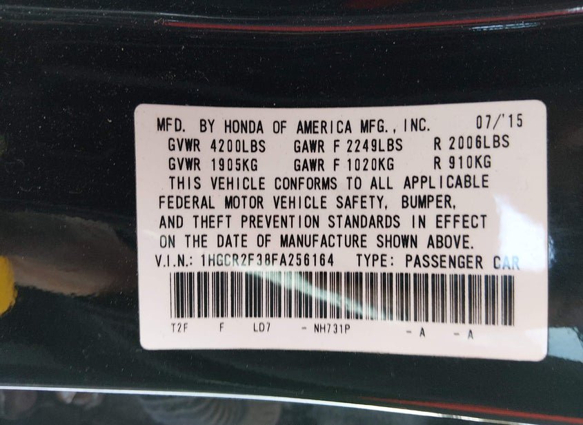 - VIN: 1HGCR2F38FA256164