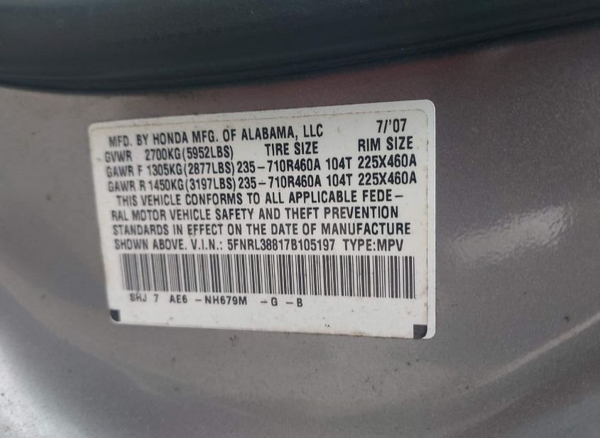 - VIN: 5FNRL38817B105197