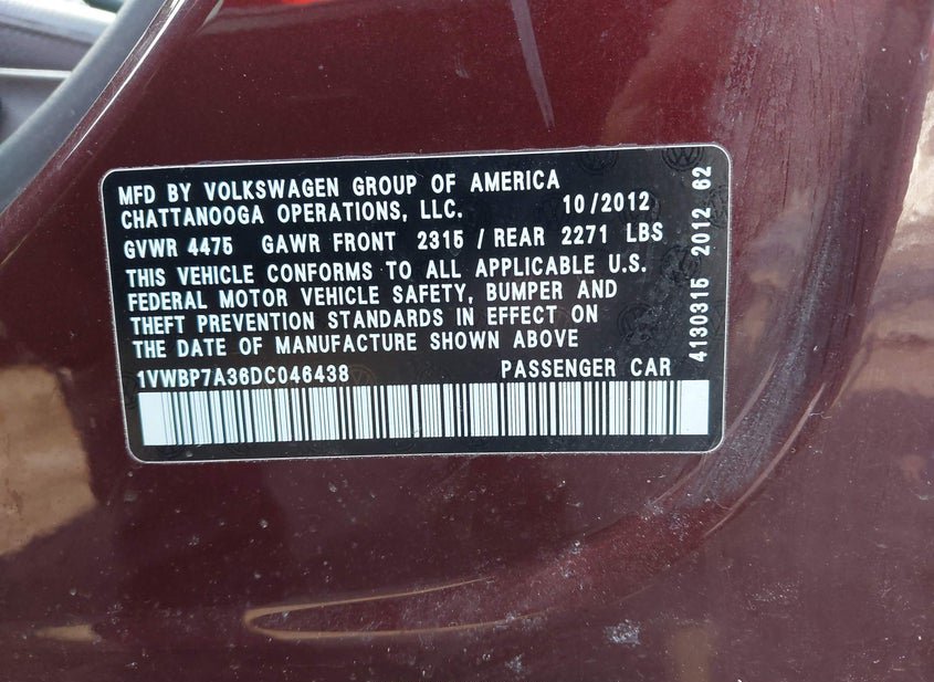 - VIN: 1VWBP7A36DC046438