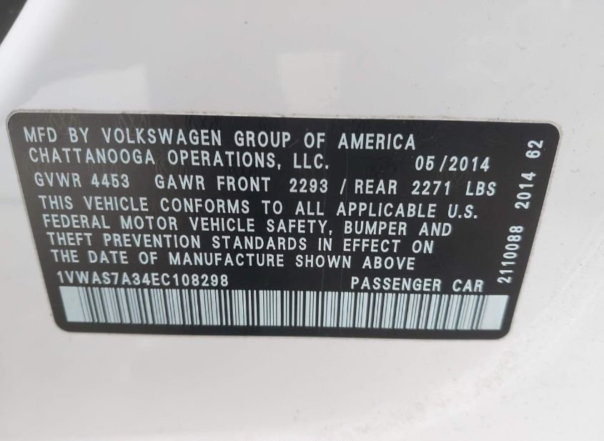 - Название лота: 2014 VOLKSWAGEN PASSAT 1.8T S