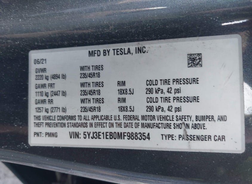 - VIN: 5YJ3E1EB0MF988354