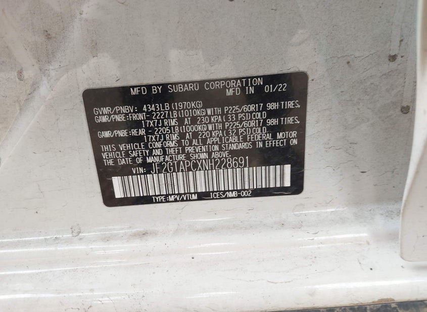 - VIN: JF2GTAPCXNH228691