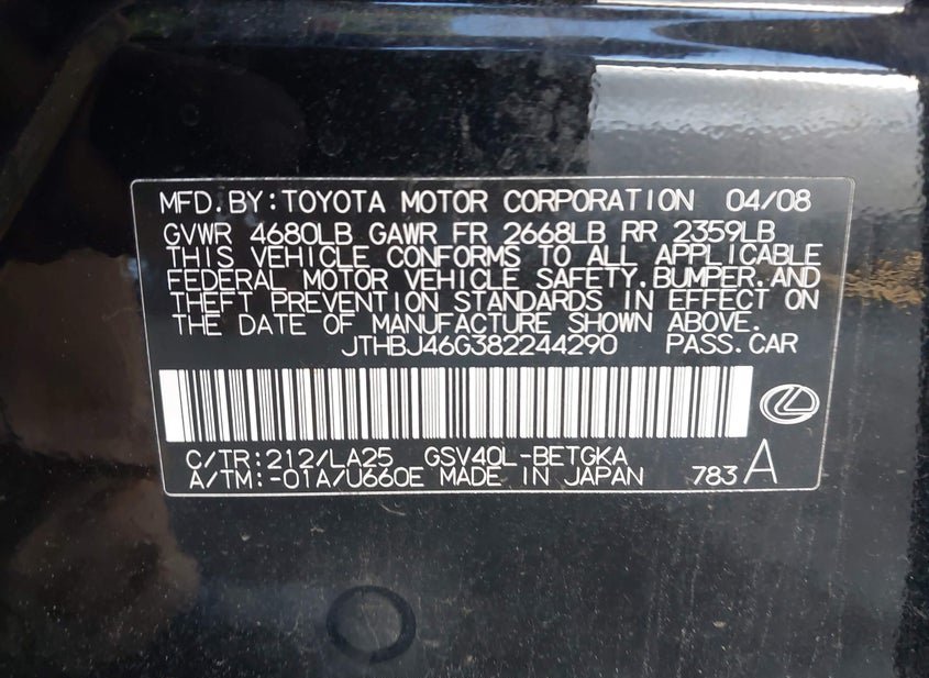 - VIN: JTHBJ46G382244290